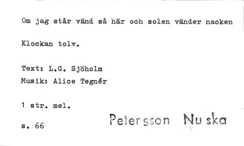 //// Om jag står vänd, så här och solen vänder nacken Klockan tolv. //// Text: L.G. Sjöholm Musik: Alice Tegnér //// 1 str, mel. //// s. 66 Peter s:,on Nu sk ////