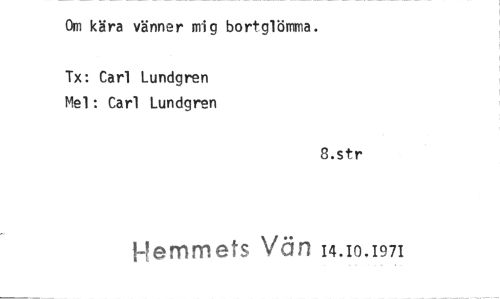 //// Om kära vänner mig bortglömma. //// Tx: Carl Lundgren Mel: Carl Lundgren //// 8.str //// Hemmets Vän 14.10.1971 ////