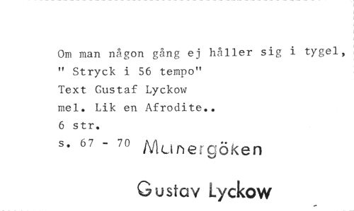 //// Om man någon gång ej håller sig i tygel, //// " Stryck i 56 tempo" //// Text Gustaf Lyckow //// mel. Lik en Afrodite.. //// 6 str. //// s. 67 - 70 Munergöken //// G u stav Lyckow ////