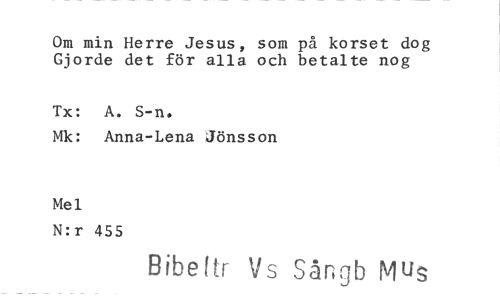 //// Om min Herre Jesus, som på korset dog Gjorde det för alla och betalte nog //// Tx: A. S-n. //// Mk: Anna-Lena Jönsson //// Mel //// N:r 455 //// Bibeltr Vs Sångb Mus ////