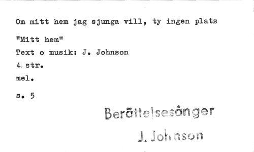 //// Om mitt hem jag sjunga vill, ty ingen plats //// "Mitt hem" //// Text o musik: J. Johnson 4 str. //// mel. //// s. 5 //// Bert tte!sr,965n1 r i Jo ;spri ////