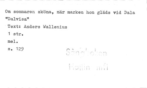//// Om sommaren sköna, när marken hon gläds vid Dala //// "Dalvisa" //// Text: Anders Wallenius //// 1 str. //// mel. //// s. 129 ////