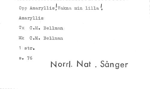 //// Opp Amaryllis,Vakna min lilla, //// Amaryllis: //// Tx C.M. Bellman //// ;tik C.M. Bellman //// 1 str. //// s. 76 //// Norrl. Nat . Sånger ////