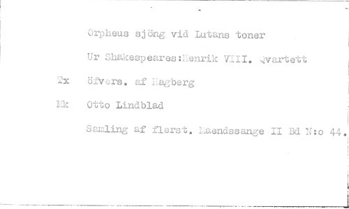 //// Orpheus sjöng vid Lutans toner //// Ur Shakespeares:henrtk VIII. var tett //// öfvers. af Lagberg //// kik Otto Lindblad //// Sagling af flerst, Laendssange II Bd N:o 44,, ////