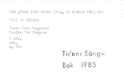 //// Oss göres inte tiden lång, vi älskar färg och Till en målare //// Text: Emil Hagström Musik: Tor Bergner //// 3 str. mel. //// s. 328 //// Tic'ens SCtng- //// Bok 1985 ////