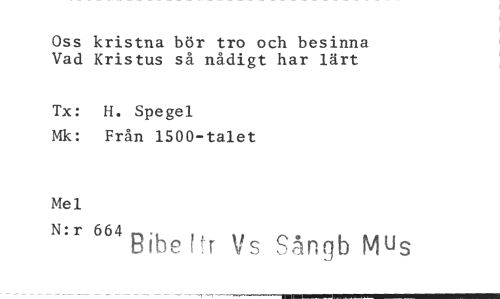//// Oss kristna bör tro och besinna Vad Kristus så nådigt har lärt //// Tx: H. Spegel //// Mk: Från 1500-talet //// Mel //// N:r 664 Bibe! r Vs Sångb Mus ////