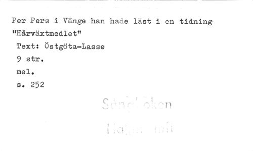 //// Per Pers i Vänge han hade läst i en tidning //// "Hårväxtmedlet" //// Text: Östgöta—Lasse //// 9 str. //// mel. //// s. 252 ////