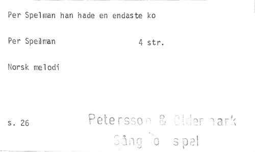 //// Per Spelman han hade en endaste ko //// Per Spelman 4 str. //// Norsk melodi //// s. 26 Fete rssor .$ //// In .r.121 //// 1,..$ //// spel ////