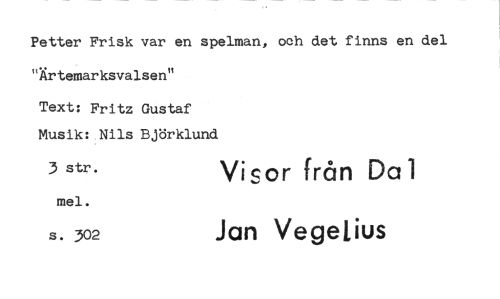 //// Petter Frisk var en spelman, och det finns en del "Ärtemarksvalsen" //// Text: Fritz Gustaf Musik: Nils Björklund //// 3 str. Visor från Dal //// mel. //// s. 302 Jan Vegelius ////