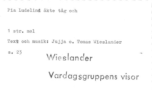 //// Pia Ludelind åkte tåg och //// 1 str. mel //// Text och musik: Jujja o. Tomas Wieslander //// s. 23 Wieslander //// Vardagsgruppens visor ////