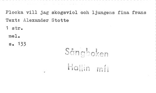 //// Plocka vill jag skogsviol och ljungens fina frans //// Text: Alexander Stotte //// 1 str. //// mel. //// s. 133 //// Sa° n o n ity; tn rnfi ////