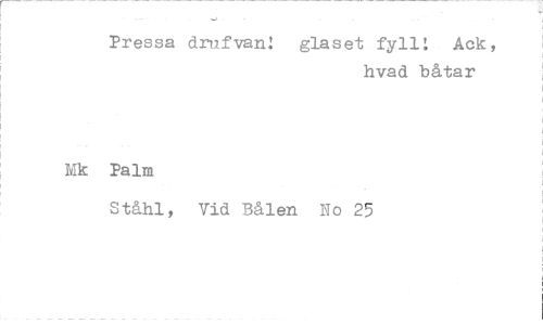 //// Pressa drufvan! glaset fyll! Ack, //// hvad båtar //// 1,1k Palm //// Ståhl, Vid Bålen No 25 //// r ////