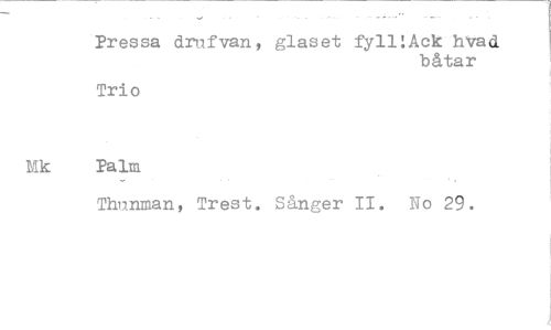 //// Pressa drudvan, glaset fyll:Ack byed //// båtar //// Trio //// Mk Palm //// Thunman, Trest. Sånger II. No 29. ////
