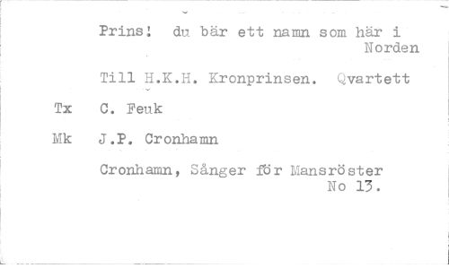 //// Prins! du bär ett namn som här i //// Norden //// Till H.K.H. Kronprinsen. Qvartett Tx C. Feuk //// Mk J.P. Cronhamn //// Cronhamn, Sånger för Mansröster //// No 13. ////