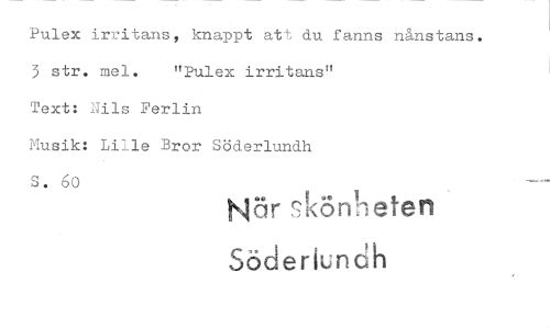 //// Pulex irritans, knappt att du fanns nånstans. //// 3 str. mel. "Pulex irritans:" //// Text: Nils Ferlin //// Musik: Lille Bror Söderlundh S. 60 //// N5r r1(5n!leten //// Söderiu-lh ////