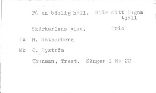 //// På en ödslig häll. Står mitt lugna //// tjäll //// Skärkarlens visa. Trio //// Tx H. Sätherberg 0. 3yström //// Thunman, Trest. Sånger I No 22 ////