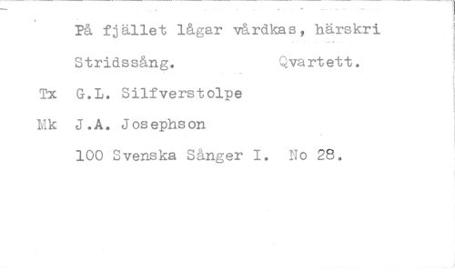//// På fjället lågar vårdkas, härskri //// Stridssång. Qvartett. //// Tx G.L. Silfverstolpe //// I ik J.A. Josephson //// 100 Svenska Sånger I. No 28. ////