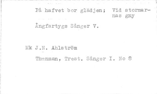 //// På hafvet bor glädjen; Vid stormar- //// nas //// Ängfartygs Sånger V. //// Tik J.N . Åhlström //// Thnnman, Trest. Sånger I. No 8 ////