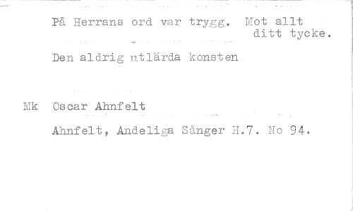 //// På Herrans ord var trygg. MOt allt //// ditt tycke. //// Den aldrig utlärda konsten //// Mk Oscar Ahnfelt //// Ahnfelt, Andeliga Sånger H.7. No 94. ////