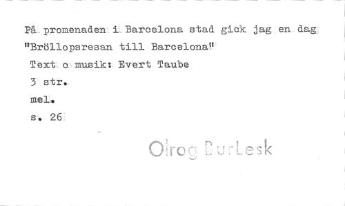 //// På. promenaden i. Barcelona stad gick jag en dag, //// "Bröllopsresan till Barcelona" //// Text ..o musik: Evert Taube //// 3 str. //// tuel. //// s. 26 ////