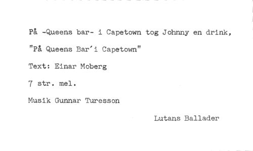 //// På -Queens bar- i Capetown tog Johnny en drink, //// "På Queens Bar'i Capetown" //// Text: Einar Moberg //// 7 str. mel. //// Musik Gunnar Turesson //// Lutans Ballader ////