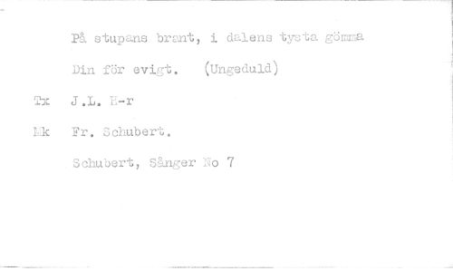 //// På stupans brant, i dalens tysta gömma //// Din för evigt. (Ungeduld) //// Tx J.L. E-r //// Lic Fr. Schubert. //// Schubert, -.Inger No 7 ////