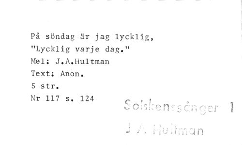 //// På söndag är jag lycklig, (7 r //// "Lycklig varje dag." //// Mei; J.A.Hultman //// Text: Anon. //// 5 str. //// Nr 117 s. 124 //// n75 //// „., //// t I •, -111 ////