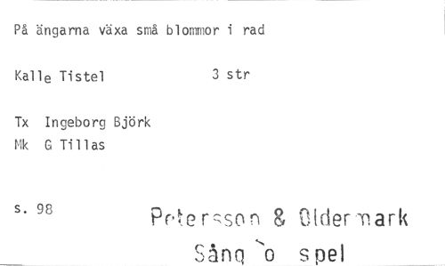 //// På ängarna växa små blommor i rad //// Kalle Tistel 3 str //// Tx Ingeborg Björk Nk G Tillas //// s. 98 P ,terson g Oldermark //// Sång o spel ////