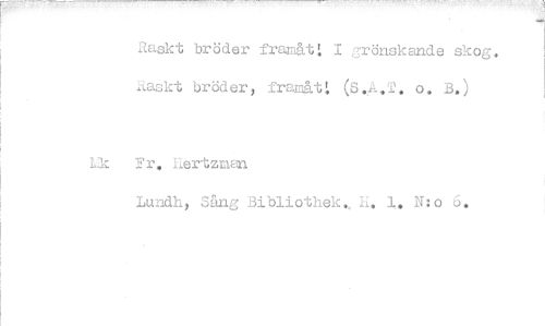 //// Raskt bröder framåt! I grönskande skog. ILLaskt bröder, framåt (S,A.T. o. B.) //// Lk Fr, Eertzman //// Lundh, Sång Bibliothek, h. 1. N:o 6. ////