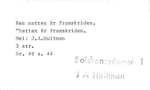 //// Ren natten är framskriden. "Natten är framskriden. Mel: J.A.Hultman //// 3 str. //// Nr. 40 s. 44 //// n: 5 i73,--Dr 7 ////