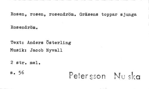 //// Rosen, rosen, rosendröm. Gräsens toppar sjunga Rosendröm. //// Text: Anders Österling Musik: Jacob Nyvall //// 2 str, mel. s. 56 Peter son sKa ////