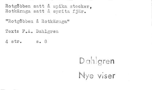 //// Rotg8bben satt å spika stockar, Rotkärnga satt å sprita fjär. //// "Rotebben å Rotkärnga" Text: F.A. Dahlgren //// 4 str. s. 8 //// Di" 1.p.cren //// Nye visgir ////