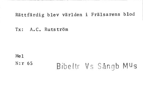 //// Rättfärdig blev världen i Frälsarens blod Tx: A.C. Rutström //// Mel //// N:r 65 B ib e I r Vs Sångb Mus ////