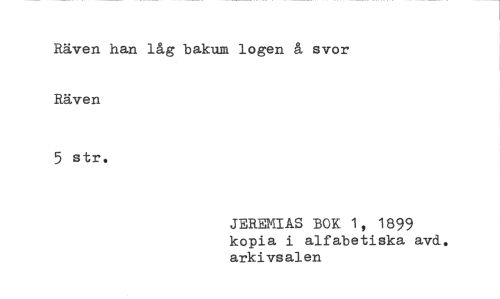 //// Räven han låg bakum logen å svor Räven //// 5 str. //// JEREMIAS BOK 1, 1899 kopia i alfabetiska avd. arkivsalen ////