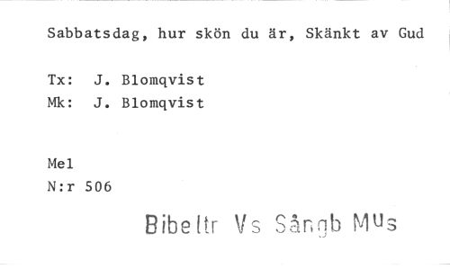 //// Sabbatsdag, hur skön du är, Skänkt av Gud //// Tx: J. Blomqvist Mk: J. Blomqvist //// Mel //// N:r 506 //// Bibe ltr Vs Sånrjb Mus ////