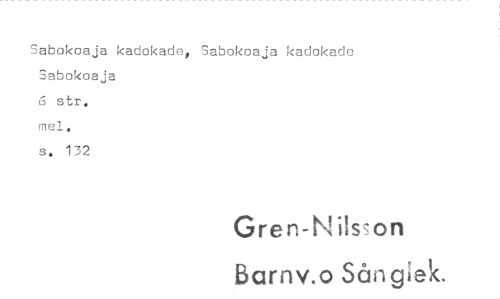 //// Sabokoaja kadokade, Sabokoaja kadokade //// Sabokoaja //// 6 str. //// mel. //// s. 132 //// Gren-Nilsson //// Barm° Sång ek. ////