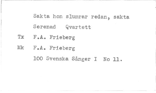 //// Sakta hon slumrar redan, sakta //// Serenad Qvartett //// Tx F.A. Frieberg //// Ek F.A. Frieberg //// 100 Svenska Sånger I No 11. ////