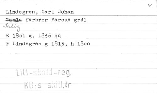 //// Lindegren, Carl Johan ~a farbror Marcus gräl //// E 18o1 g, 1836 qq //// F Lindegren g 1813, h 1800 //// KB:s tf ////
