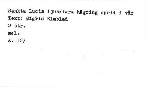 //// Sankta Lucia ljusklara hägring sprid i vår //// Text: Sigrid Elmblad //// 2 str. //// mel. //// s. 107 ////