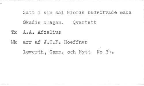 //// Satt i sin sal Niords bedröfvade maka //// Skadis klagan. Qvartett //// Tx A.A. Afzelius //// Mk arr af J.C.F. Hoeffner //// Lewerth, Gamm. och Nytt No 34. ////
