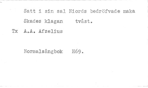 //// Satt i sin sal Niords bedröfvade maka //// Skades klagan tvåst. //// Tx A.A. Afzelius //// Normalsångbok H69. ////