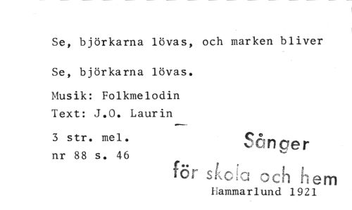 //// Se, björkarna lövas, och marken bliver Se, björkarna lövas. //// Musik: Folkmelodin Text: J.O. Laurin //// 3 str. mel. nr 88 s. 46 Sånger r si-c-1 //// för 1 -och fl em //// hammarlund 1921 ////