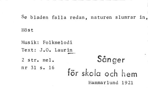 //// Se bladen falla redan, naturen slumrar in, Höst //// Musik: Folkmelodi Text: J.O. Laurin //// 2 str. mel. Sånger //// nr 31 s. 16 //// för skola och hem //// Hammarlund 1921 ////