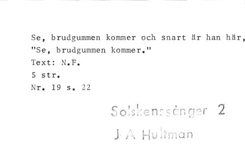 //// Se, brudgummen kommer och snart är han här, //// "Se, brudgummen kommer." //// Text: N.F. //// 5 str. //// Nr. 19 s. 22 //// 5 sång.,g,..r //// J- gan ////