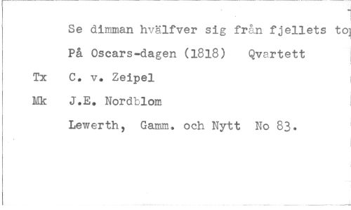 //// Se dimman hvälfver sig från fjellets tok //// På Oscars-dagen (1818) Qvartett //// Tx C. v. Zeipel //// Mk J.E. Nordblom //// Lewerth, Gamen. och Nytt No 83. ////