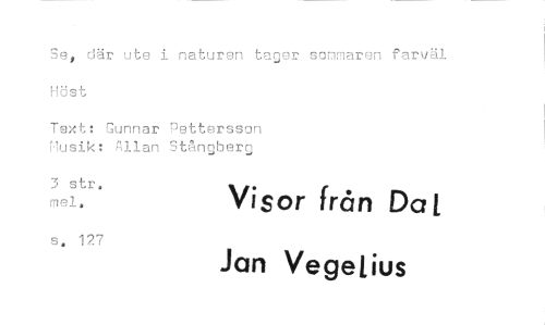 //// Se, där ute i naturen tager sommaren farväl Höst //// Text: Gunnar Pettersson Musik: Allan Stångberg //// 3 str. mei. Visor från Dal //// s. 127 Jan Vegejius ////