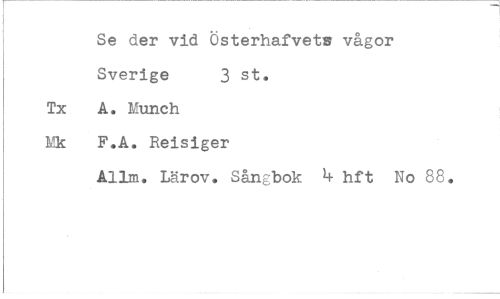 //// Se der vid Österhafvets vågor //// Sverige 3 st. //// Tx A. Lunch //// Mk F.A. Reisiger //// Allm. Lärov. Sångbok 4 hft No 88. ////