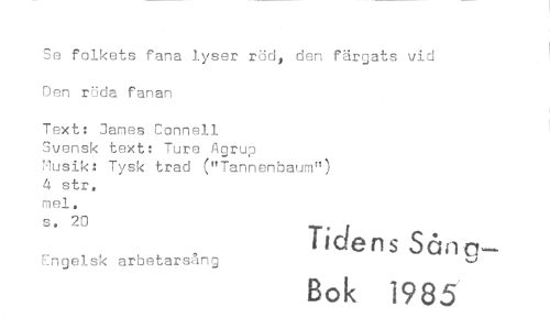 //// Se folkets fana lyser röd, den färgats vid Den röda fanan //// Text: James Connell //// Svensk text: Ture Agrup //// Musik: Tysk trad ("Tannenbaum") //// 4 str. //// mel. //// s. 20 //// Tidens Sång— //// Engelsk arbetarsång //// Bok 1985 ////