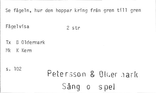 //// Se fågeln, hur den hoppar kring från gren till gren //// Fågel visa 2 str //// Tx E Oldermark Mk K Kern //// s. 102 Petersson 8 Okier Jarl< //// Sång o spel ////