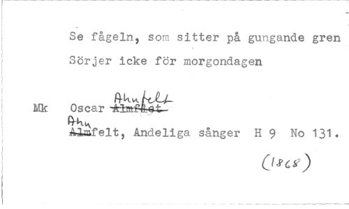 //// Se fågeln, som sitter på gungande gren Sörjer icke för morgondagen //// Mk Oscar //// A-kt,‘ //// Almfelt, Andeliga sånger H 9 No 131. ////